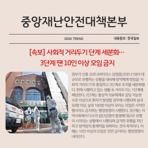 방역체계 명칭을 '사회적 거리두기'로 통일하고 3단계로 조치를 세분화했다.