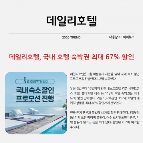 데일리호텔은 8월 여름휴가 시즌을 맞아 국내 숙소 할인 프로모션을 진행한다고 2일 발표했다.
