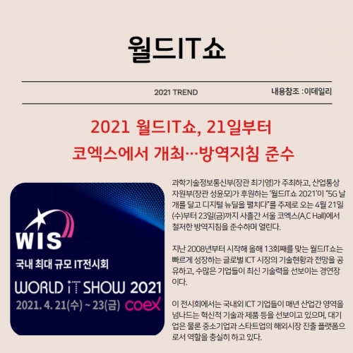 [2021 월드IT쇼, 21일부터 코엑스에서 개최…방역지침 준수]