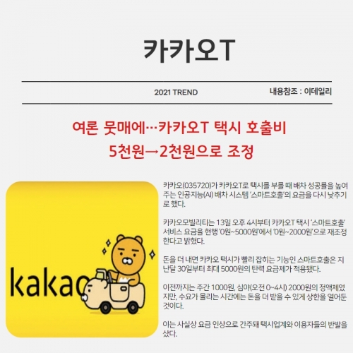 [여론 뭇매에…카카오T 택시 호출비 5천원→2천원으로 조정]