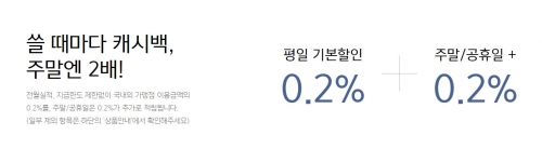 평일은 0.25%, 주말 및 공휴일은 0.4% 캐시백이 가능하고,