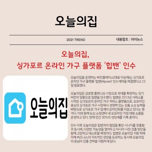 오늘의집을 운영하는 버킷플레이스(대표 이승재)는 싱가포르 온라인 가구 플랫폼 '힙밴(Hipvan)' 인수계약을 체결했다고 23일 발표했다.