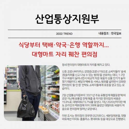 2일 산업통상자원부의 '2021년 주요 유통업계 매출동향'에 따르면 지난해 유통업 전체 매출 중 차지한 편의점의 비중은 15.9%로, 대형마트(15.7%)를 앞섰다. 지난 2020년까지만 해도 온라인과 백화점에 이어 3위에 올랐던 대형마트 비중이 처음으로 편의점에 밀려난 모양새다. 이번 조사는 편의점의 경우엔 GS25와 CU, 세븐일레븐을, 대형마트에선 이마트·홈플러스·롯데마트 등을 대상으로 진행됐다.