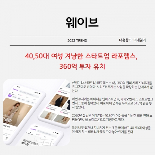 2020년 설립된 이 업체는 40,50대 여성들을 겨냥한 의류 판매 쇼핑몰 '퀸잇'을 스마트폰으로 제공하고 있다. 특히 너무 짧거나 지나치게 끼는 옷을 배제하고 40, 50대 여성들이 즐겨 찾는 의류업체들을 모아 놓아 인기를 끈다.