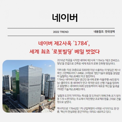 2016년 착공을 시작한 네이버 제2사옥 '1784'는 '테크 컨버전스 빌딩'을 컨셉으로 건축된 세계 최초의 로봇 친화형 빌딩이다.