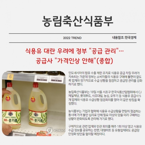 인도네시아의 팜유 수출 제한 조치로 식용유 공급 차질 우려가 지속되는 가운데 정부는 소비자들의 식용유 구매에 불편이 없도록 업계와 정기적으로 수급 상황을 점검하고 공급망 관리를 강화하기로 했다.
