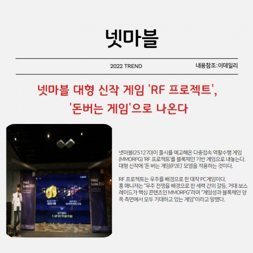 넷마블(251270)이 출시를 예고해온 다중접속 역할수행 게임(MMORPG) ‘RF 프로젝트’를 블록체인 기반 게임으로 내놓는다.