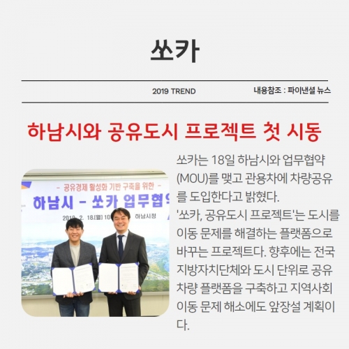 쏘카는 18일 하남시와 업무협약(MOU)를 맺고 관용차에 차량공유를 도입한다고 밝혔다.